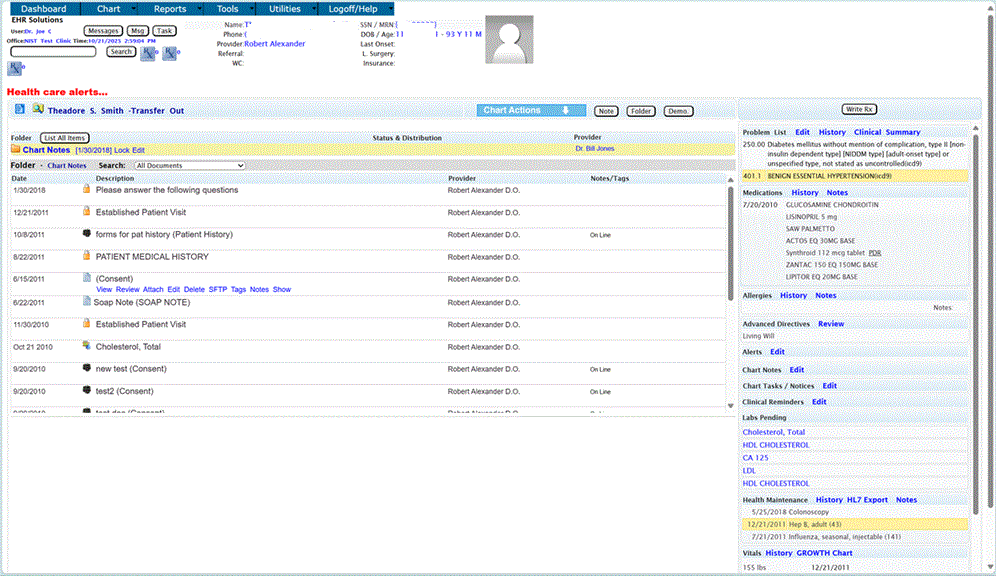 Displays all office visits, notes, orders, prescriptions, reports and pertinent patient information